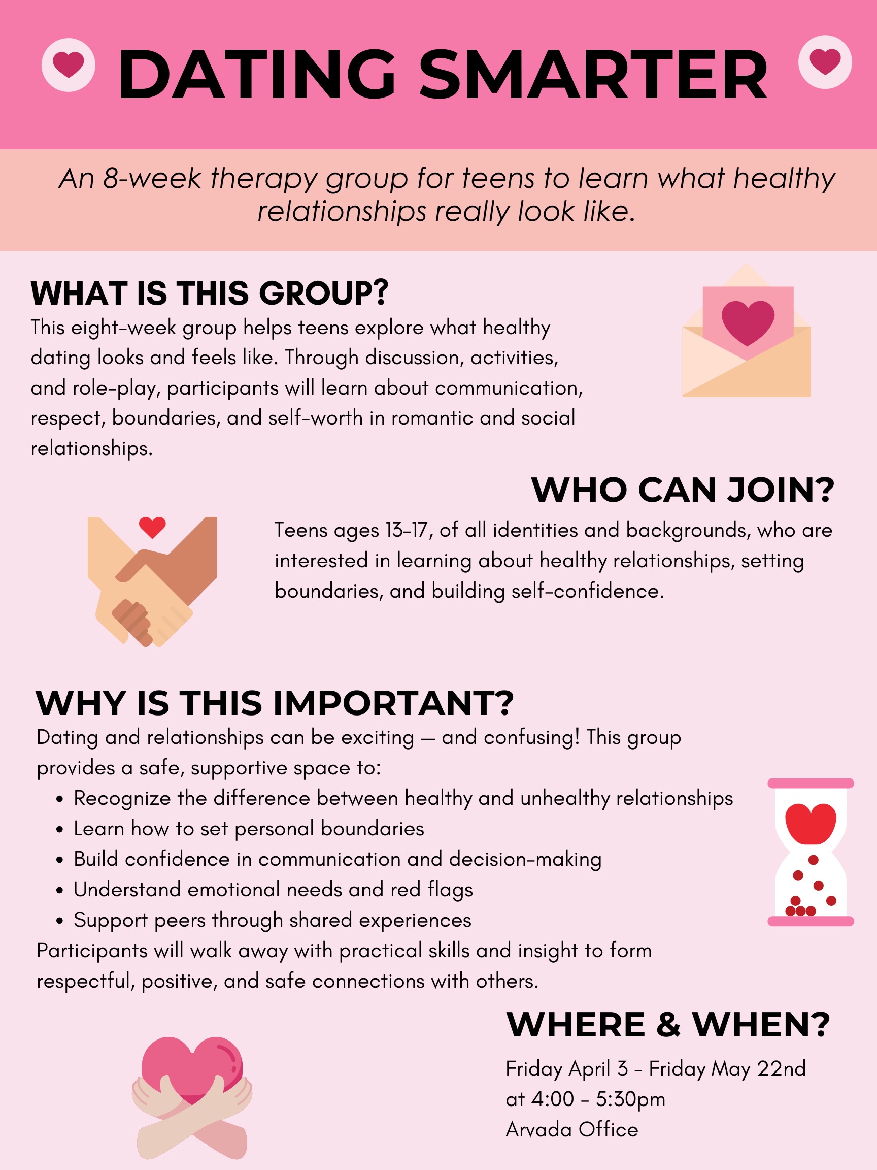 This eight-week group helps teens explore what healthy dating looks and feels like. Through discussion, activities, and role-play, participants will learn about communication, respect, boundaries, and self-worth in romantic and social relationships.